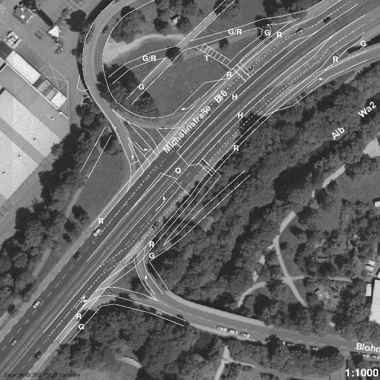 Das Areal der Haltestelle in ein Luftbild skizziert als Beispiel einer möglichen Ausgestaltung der neuen Verkehrsführung samt Haltestelle. H=Haltestelle (80,m), G=Gehweg, G/R=Geh- und Radweg, R=Radspur/-weg, T=Treppe, Q=Gleisquerung für Abbieger.