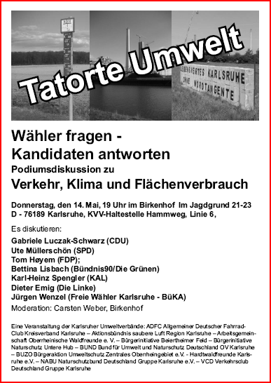 Anlässlich der bevorstehenden Kommunalwahl haben die Karlsruher Umweltorganisationen am 14.5. wieder eine Podiumsdiskussion veranstaltet, die sich den Fragen des Natur- und Umweltschutzes widmete.