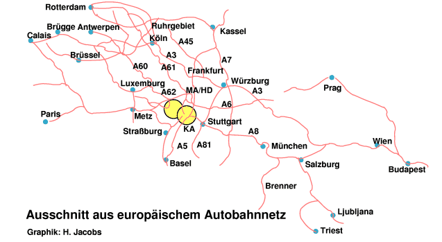 Werfen wir einen Blick auf das abgebildete europäische Autobahnnnetz: Von Atlantik und Nordsee her mit seinen Häfen und von Zentren wie Paris und Brüssel führen mehrere Routen ins südliche Osteuropa und nach Süddeutschland: im Norden A3 und A45, in der Mitte A6 und A61. Dann gibt es noch die südlichste Route nördlich der Alpen mit der A8. Von der Nordsee käme man über A60 und A62, von Paris über Saarbrücken –- wenn, ja wenn da nicht zwei Lücken wären: Im Pfälzer Wald und unser Karlsruhe! Für den Pfälzer Wald gab es mal die Planung, westliche und östliche A8 zu verbinden (siehe autobahn-online.de). Dies ist zum Glück gestorben, dafür plant man scheibchenweise den autobahnähnlichen B 10-Ausbau (siehe bi-queichtal.de) im Pfälzer Wald. Und für den Engpass Karlsruhe plant man ja Nordtangente und 2. Rheinbrücke! Der ADAC hat in einer Studie festgestellt, dass der Pkw-Verkehr mittlerweile stagniert und nur noch der Lkw-Verkehr wachsen wird. Und genau eine solche transeuropäische Schwerverkehrsachse soll nach einigen Politiker durch den Hardtwald!