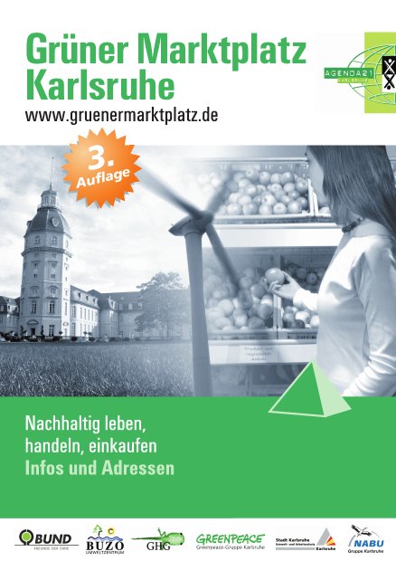 Der Einkaufsführer „Grüner Marktplatz Karlsruhe“ wurde überarbeitet und liegt in der nunmehr dritten Auflage vor. Mit dieser Broschüre kann der Leitgedanke der Lokalen Agenda 21 „Global denken — lokal handeln“ in die Tat umgesetzt werden. Sie bietet Verbraucherinnen und Verbrauchern die Möglichkeit, durch ihre Nachfrage und ihr Handeln Märkte zu verändern.