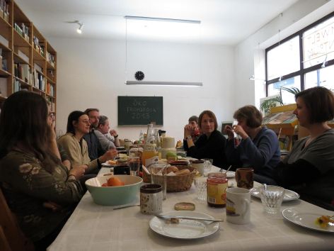 | Angeregte Gespräche beim diesjährigen Ökofrühstück am 2. Februar im Umweltzentrum mit leckeren Brötchen und Kuchen, gespendet von der Fasanenbäckerei; Foto: Uwe Haack |