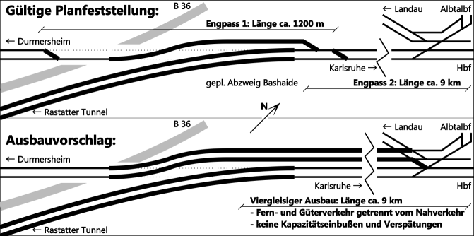 Es muss damit gerechnet werden, dass die beiden zweigleisigen Streckenabschnitte Karlsruhe — Ettlingen West — Rastatt und Karlsruhe — Forchheim — Bashaide pro Tag und Richtung zusammen etwa 285 Züge (Nahverkehr, Fernverkehr, Güterverkehr) aufnehmen müssen, während für die viergleisige Strecke Rastatt Süd — Basel im Querschnitt südlich Rastatts wegen des Abzweigs ins Murgtal nur 205 Züge übrig bleiben. Die heutigen Mängel — u. a. können zwei Haltepunkte auf der Ettlinger Strecke wegen fehlender Kapazität nicht bzw. nur beschränkt in Betrieb genommen werden — blieben erhalten oder würden sich eher noch gravierend verschärfen. Befriedigende Angebots-, Fahrplan- und Betriebsqualität sind mit dem bislang geplanten Ausbau nicht zu erreichen.
