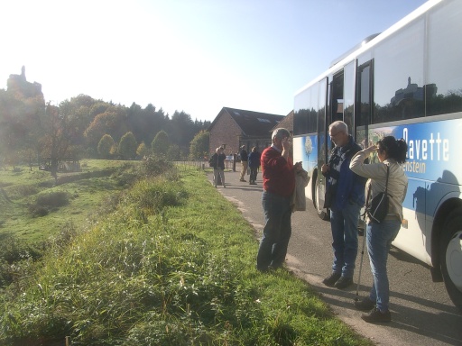Um die Mittagszeit starteten die Ausflugsgruppen pünktlich an den Bahnhöfen Straßburg und Karlsruhe. Bei mildem sonnigem Herbstwetter trafen beide fast gleichzeitig in Weißenburg ein. Optimal ist hier der Busanschluss zum Wanderbus 317. Dieser ist auf die ankommenden Züge vertaktet und steht abfahrbereit am Bahnhofsvorplatz des modernisierten Bahnhofes. Nach einem kurzen Gruppenfoto ging die Fahrt in einem modernen Reisebus über Lembach zur Burg Fleckenstein. Die Fahrt verläuft über kleine typisch elsässische Dörfer und durch Wälder, die um diese Jahreszeit in allen Gelb- und Rottönen leuchteten. Endhaltestelle des Busses 317 ist die Burg Fleckenstein. Dort angekommen teilte sich die Gruppe, die ungefähr 20 Teilnehmer umfasste, in zwei kleinere Gruppen auf. Gruppe 1 machte eine Drei-Burgen-Wanderung durch die malerischen Vogesen zu den Burgruinen Hohenburg und Löwenstein. Gruppe 2 besichtigte die sehr schön restaurierte Burgruine Fleckenstein, die sich auf Grund des Angebotes für Kinder optimal als Familienausflugsziel eignet. Von der Burg aus hat man einen traumhaften Blick auf die Vogesen, den Pfälzer Wald und das Elsass. Nach der Besichtigung ging es über einen schönen Waldweg zum 20 min entfernten Gimbelhof. Dieser schön restaurierte Bauernhof ist eine ideale Rastmöglichkeit. Nach einer Pause, in der wir uns mit Kaffee und Kuchen stärkten, ging es zurück zur Burg Fleckenstein, wo unser Bus schon auf uns wartete, um uns zurück nach Weißenburg zu bringen. Dort angekommen setzte schon die Dämmerung ein. Wir entschlossen uns, erst einmal einen kleinen Rundgang durch das malerische Städtchen an der Lauter mit seinen schönen Fachwerkhäusern zu machen. Besonders sehenswert ist die Abteikirche Sankt Peter und Paul. Zum Abschluss gingen wir ins Restaurant Krone direkt am Rathausplatz von Weißenburg. Bei Elsässer Spezialitäten wie verschiedenen Flammkuchen kam die ganze Gruppe ins Gespräch. Viel zu schnell verging die Zeit, denn um kurz nach halb neun mussten wir pünktlich am Bahnhof sein, um die letzten Züge nach Straßburg und Karlsruhe zu erreichen. Ein wundervoller Herbsttag ging mit einer pünktlichen Ankunft an den Zielbahnhöfen zu Ende.