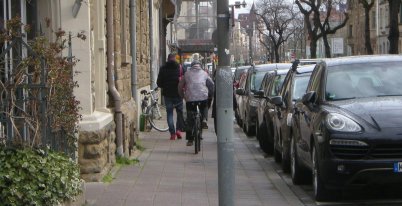 | Langstrecken-Gehwegradler neben Tempo-30-Straße; Fotos: Uwe Haack | |