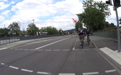 | Sportlicher Ersatz-Verkehr Durlach 2022: Nur hier am hinteren Ende des Bahnsteigs kann man ihn offiziell verlassen, über die 1. Ampel, dann zur 2. und flugs hat man beim 2. Baum der Reihe (roter Pfeil) schon nach kurzer Wanderung den Anfang der SEV-Bushaltestelle auf dem Radweg erreicht; Actioncam-Bilder: H. Jacobs |
