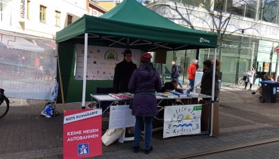 | Infostand von Klimabündnis und „Eine reicht“ gegen die zweite Autorheinbrücke und Querspange; Foto: Mari Däschner |