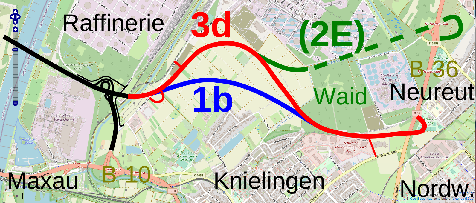 | Am 4.10.22 vorgestellte, noch verbliebene Varianten der Querspange: Schwarz = 2. Autobrücke; rot/blau = Var. 3d/1b; grün = Var. 2E, die müsste aus Umweltgründen im Tunnel geführt werden, was dieser für Neureut besseren Variante wirtschaftlich das Genick bricht; Grafik: H. Jacobs, Basis © Openstreetmap und Mitwirkende |