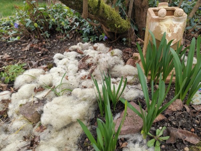 Schafwolle kann nicht nur den Boden bedecken und in ihren Fasern Wasser sehr gut speichern. Sie düngt auch durch die langsame Zersetzung ähnlich wie Hornspäne. Da Wolle einen Eigengeruch hat, soll sie abwehrend gegen Schnecken und Wühlmäuse wirken. Und weil der Boden bedeckt ist, sollen Beikräuter unterdrückt werden. All das wollen die Gärtner*innen in der kommenden Gartensaison testen.