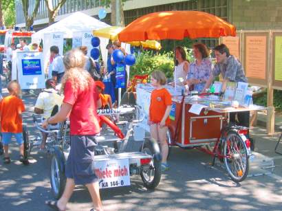 Zwei Spezialräder in Aktion: Eins als 4-Personen-Familien-Transportmittel und eins als Info-Stand von BUZO und VCD, an dem wir weitere Transportmöglichkeiten mit Fahrrädern demonstrierten. Am Stand von links nach rechts: Petra Schenk, Margarete Ratzel und Johannes Stober. Foto: Heiko Jacobs |