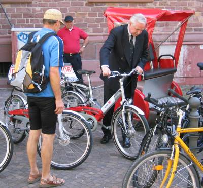 | Fachgespräch zwischen OB Fenrich und VCD-Mitglied Walter Suppanz bzgl. der Leih-Fahrräder der DB-Firma Call-a-Bike |