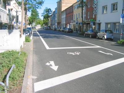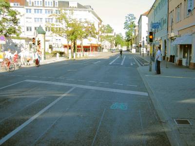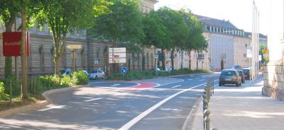 | Neue Rad- und Angebotsstreifen auch zum Abbiegen von der Hans-Thoma-Straße in Akademie- und Stephanienstraße hinein |