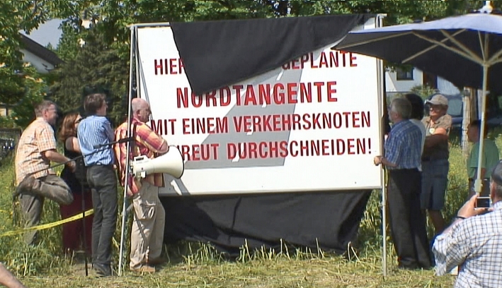 Die bei der Veranstaltung aufgestellte Tafel ist analog zur großen Infotafel in der Waldstadt. Klaus Bluck, Sprecher des Aktionsbündnisses, sagte dazu: Es kann nicht sein, dass eine Autobahn quer durch eine Großstadt gebaut wird, damit Schweinehälften aus Ungarn schneller nach Belgien kommen.