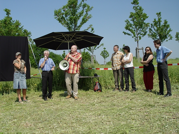 | Bei der Aktion wurde eine große Tafel mit der Aufschrift “Hier würde die geplante Nordtangente Neureut mit einem Verkehrsknoten durchschneiden” enthüllt. Die Enthüllung führten neben Neureuts Ortsvorsteher Jürgen Stober, Dr. Ulrike Fien (stellv. Vorsitz. des BV Heide), Carsten Weber (Landesnaturschutzbeauftragter), Rainer Karcher (Vorsitz. der Hardtwaldfreunde) und Ortschaftsrat Klaus Bluck auch einige Mandatsträger wie MdB Karin Binder (Die Linke), MdL Dr. Gisela Splett (Grüne) und MdL Johannes Stober (SPD) durch. |