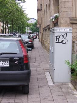 Doch mit dem zu Fuß gehen ist das so eine Sache, denn nicht jede Straße bietet dafür gute Voraussetzungen. Auf vielen, viel zu vielen Gehwegen ist die Fortbewegung zu Fuß mit Komplikationen verbunden, die unbekümmertes Laufen verhindern. Hindernisse wie Verkehrsschilder, Schaltkästen und Mülltonnen bevölkern die Gehwege. Hinzu kommen geparkte Autos und häufig auch gedankenlose und uneinsichtige Radfahrer. Das größte Hindernis sind die geparkten Autos, die oft ohne Notwendigkeit die Gehwege verstellen. Man muss feststellen, dass in Karlsruhe generell auf Gehwegen geparkt wird. Ausnahmen gibt es nur dort, wo bauliche Maßnahmen dies kenntlich machen oder verhindern. Sonst gilt: Egal wie breit der Gehweg, egal wie breit die Fahrbahn, egal ob aus nachvollziehbaren Gründen oder nicht, Autos stehen auf dem Gehweg. Und oft bleibt es dem Autofahrer überlassen, wieviel Platz er den Fußgängern übrig lässt. Ein trauriges Beispiel ist die Eisenlohrstraße, eine verkehrsarme Straße mit schönen Gründerzeithäusern in der Weststadt. Hier leben viele Familien mit Kindern und am westlichen Ende befindet sich das Alten- und Pflegeheim „Anna Walch“. Die Kulisse stimmt, das Klientel für die Fortbewegung zu Fuß ist vorhanden, nur die Gehwege sind eine Zumutung. Hier parkt jeder wie er will.