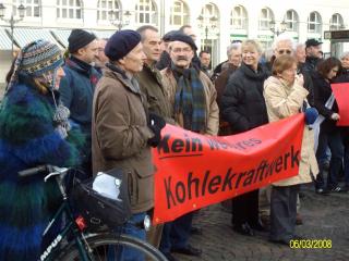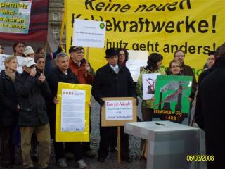 | Am 06.03.08 war die „Ländersache“ zu Gast auf dem Karlsruher Marktplatz. Der Beitrag „Streit um Kohlekraftwerk — wo soll der Strom in Zukunft herkommen?“ wurde am gleichen Abend im SWR 3-Fernsehen ausgestrahlt. Etliche Umweltvereine, das Aktionsbündnis Saubere Luft Karlsruhe (dem auch die BUZO angehört), Karlsruher Bürgervereine und viele Bürgerinnen und Bürger demonstrierten bei dieser Gelegenheit friedlich gegen das geplante Kohlekraftwerk. Fotos: Anton Maslow |