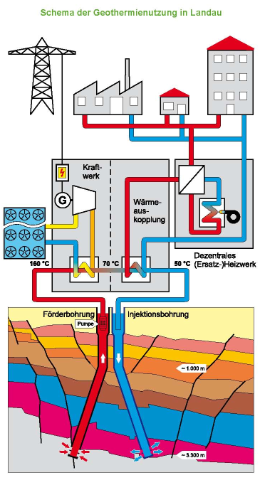 Wer einmal in einem Bergwerk war, weiß, dass es immer wärmer wird, je tiefer man in die Tiefe steigt. In Landau macht man sich das zunutze und erzeugt mit dieser Energie 3 MW Strom für ca. 6.000 Haushalte. Mit der Restwärme können darüber hinaus 300 Haushalte mit Fernwärme versorgt werden. Bis dahin war es aber ein langer Weg. Genau gesagt 3,5 km fast senkrecht nach unten. Anders als in den meisten anderen Regionen gibt es im Oberrheingraben Gesteinsschichten, die in dieser Tiefe 160°C heißes Wasser führen. Mit zwei Tiefenbohrungen wurden diese Schichten angezapft. Der vor dem Bau des eigentlichen Kraftwerks weithin sichtbare Bohrturm bohrte sich Schicht für Schicht in den Untergrund. Etappenweise wurde ein Betonrohr gegossen, durch das heißes Wasser nach oben gefördert wird und ein Zweites, mit dem das abgekühlte Wasser wieder in die Tiefe gepresst wird.