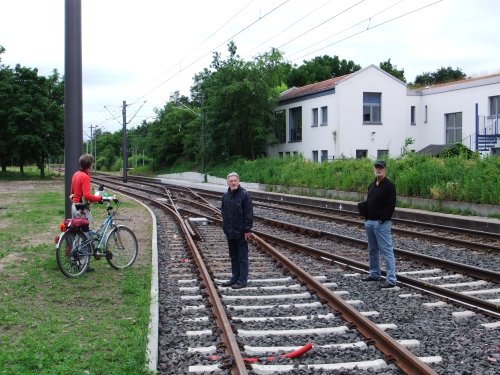 | BUZO-Exkursion zu Verkehrsmaßnahmen rund um den Weinbrennerplatz. Hier wird nahe der ersten Straßenbahnkreuzungsweiche gerätselt, warum der neue Abzweig nur eingleisig ist; Foto: H. Jacobs |