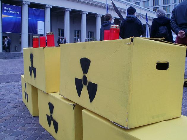 Ausgerechnet am Tag, an dem sich vor 26 Jahren in Tschernobyl der schrecklichste Atomunfall ereignete, treffen sich in Karlsruhe die Aktionäre des Atomkraftwerksbetreibers EnBW zur Jahreshauptversammlung. Eine Gruppe von vielleicht 20 bis 30 Aktiven wollte das nicht einfach so hinnehmen und platzierte sich bei einer Mahnwache mit Fahnen, Transparenten, Atommüllfässern, Kerzen und einem Gong vor dem Kongresszentrum am Festplatz, wo die Hauptversammlung statt fand. Auf diese Art sollte an die Katastrophe erinnert und an die Opfer gedacht werden. Denn die Menschen in weitem Umkreis von Tschernobyl leiden auch heute noch. Atomkraftwerke sind auch bei uns nicht sicher. Niemand weiß, wo der ganze Atommüll hin soll. Der ganze Uranbrennstoffkreislauf ist eine Umweltkatastrophe für sich. Atomstrom ist viel zu teuer, weil er Leben kostet. Trotz Atomausstieg laufen immer noch neun Atomkraftwerke in Deutschland. Die Atomlobby arbeitet mit aller Macht an einem Comeback. Doch Atomkraft ist ein großer Irrtum. Weg damit.