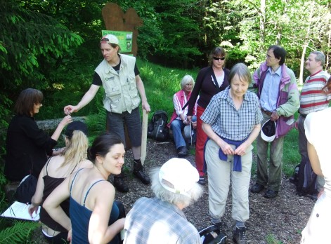 | Eine Geruchsprobe Baldrian wird rumgereicht: An danach riechenden Pflöcken reiben sich im Winter Wildkatzen und hinterlassen Haare als Nachweis; F.: Jacobs |