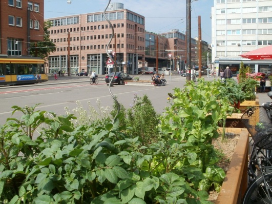 Drei Jahre nachdem das Karlsruher Urban Gardening-Projekt Fächergärtner gestartet ist, grünt und blüht es weiterhin beim Marstallgarten in der Oststadt und in den Beeten beim Budo-Club in der Weststadt. Wenn es Schnecken, Wühlmäuse und allzu gierige Passanten zulassen, werden die „Marstallgärtner“ und die „Budogärtner“ auch regelmäßig mit der Ernte von Kräutern, Gemüsen und Obst für ihr Tun belohnt. Wie schon in früheren Ausgaben der „umwelt&verkehr“ berichtet, sind es bislang diese beiden Gruppen aktiver Fächergärtner, die das Projekt dauerhaft prägen. In diesem Frühling ist auf Initiative des Gartenbauamts ein weiterer Standort hinzugekommen, an dem sich ebenfalls ein paar Fächergärtner um Pflanzen in der Stadt kümmern: Mitten auf dem Berliner Platz wurden Ende April von initial e. V. aus Holz gebaute Hochbeete aufgestellt, mit Erde befüllt und teilweise bepflanzt. Wenigstens auf ein paar Quadratmetern ist seitdem etwas Grün zu sehen auf einem ansonsten völlig trostlosen und großflächig versiegelten Platz. Besonders viele Studenten und Mitarbeiter des KIT passieren die kleine Reihe Holzkisten vor der Post täglich auf dem Weg von und zu ihren Arbeitsorten, natürlich auch zahlreiche andere Menschen. Ähnlich wie bei der Aktion in der Kaiserstraße 2013, bei der während der halbjährigen Sperrung des Straßenbahnverkehrs zwischen Kronenplatz und Marktplatz Gemüse und Blumen in sogenannten Big Bags wachsen durften, werden auch die Hochbeete auf dem Berliner Platz nur vorübergehend stehen und müssen voraussichtlich schon im Herbst diesen Jahres wieder verschwinden. Und wieder sind die Reaktionen der Passanten sehr wohlwollend, zum Teil richtig begeistert. Manche wollen gleich aktiv mitgärtnern, spenden Pflanzen oder versprechen, sich ab und zu beim Bewässern zu beteiligen, was bei den herrschenden Bedingungen in den Kisten an diesem Ort ein besonders wichtiger Beitrag ist! Ursprünglich ist geplant, nach dem Auf- und Wiederabbau einer Baustelleneinrichtung der KASIG weitere Kistenbeete aufzustellen, Platz genug ist hier auf jeden Fall. Doch zum Zeitpunkt des Redaktionsschlusses war von dieser eigentlich für Mai angekündigten Baustelle noch nichts zu sehen. Wir müssen also abwarten und hoffen, dass dann das Pflanzen von Gewächsen jahreszeitlich bedingt und für einen solch kurzen Zeitraum überhaupt noch Sinn macht. Selbstverständlich sind AnwohnerInnen und sonstige Interessierte immer willkommen, sich bei der Aktion zu beteiligen. Dafür dient auch das BUZO-Umweltzentrum als Anlaufstelle und zur Kontaktaufnahme.