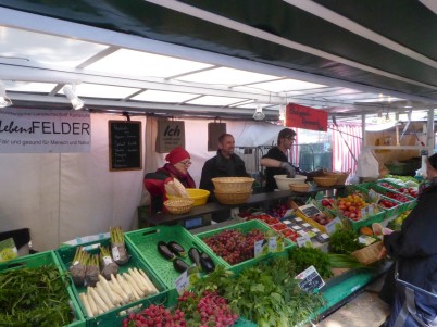 | „LebensFELDER“ auf dem Karlsruher Wochenmarkt; Foto: SoLaWi LebensFELDER |