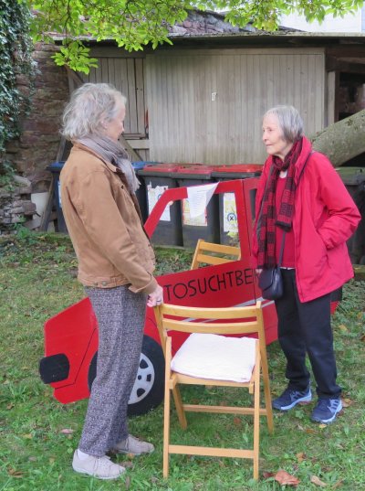 Ein Hingucker auf unseren Ständen war die Autosuchtberatung. Die Idee dazu kam aus der Verkehrsszene in Berlin. Unser Modell wurde vom AG-Verkehr-Gründer Johannes Lotter geschreinert. Durch das offene Autofenster stellte eine, sich selbst zum Diplompsychologen Dr. Sowieso ernannte Person aus dem internen Kreis ihren Patienten und Patientinnen „fachkundige“ Fragen zur Autoabhängigkeit, die auch ordentlich dokumentiert wurden. Da sich kaum eine Standbesucherin oder ein Standbesucher auf den Patientenstuhl traute, mussten wir oft auch diese Rolle selbst übernehmen, was immerhin für viel Aufsehen sorgte.