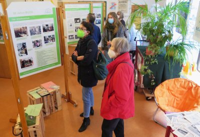 Kurzum: Am 8. Oktober um 17 Uhr wurde unsere Ausstellung eröffnet. Auf fünf Stellwänden mit zehn Infotafeln, vielen Plakaten an den Wänden und ausgelegten Publikationen wie unser früheres Vereinsblatt umweltschutz — jetzt umwelt&verkehr — wurde über die Geschichte der BUZO informiert. Vor der Eröffnungsansprache unserer Vorsitzenden Ute Rieger mit einem Rückblick auf unsere Aktivitäten gab es im grünen Teil des Hinterhofes einen Stehempfang mit Sekt, Saft, Selbstgebackenem, Salzgebäck. Dort waren auch unsere Autosuchtberatung, eine Autoattrappe aus Holz, die auf Ständen öfter zum Einsatz kam, ein Transparent mit einer aufgemalten Straßenbahn und Holzkreuze, die wir als Mahnung an die vielen Verkehrsopfer auf einer Demo 1995 in Frankfurt gegen die IAA aufgebaut hatten, zu besichtigen.
