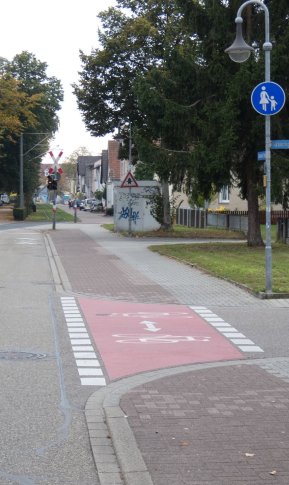 | Strittige spitzwinklige Querungsstelle mit nu umgedrehtem Verbotsschild, nach Jahren wird ein Umbau geplant. |