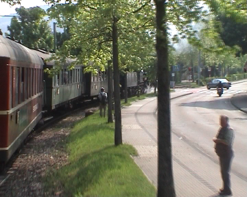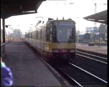 | Den Albtäler gab es früher schon mal als Albtal-Express, vmtl. 1991—1998 (oben) danach 2000/01 von/nach Heilbronn, ansonsten fahren auf der Ettlinger Seitenbahn nur Güter- und Dampfzüge (rechts), Reaktivierung ist aber geplant; Video-Ausschnitte 1996/2008: Heiko Jacobs |