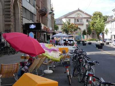 Für das Reallabor wurden die Parkplätze deutlich reduziert und dafür provisorische Sitzecken installiert, zum einen mit den von anderen Stellen schon bekannten gelben Plastikteilen, zum anderen auch ein Holzkonstrukt, dass sowohl als kleine Bühne, als auch als Sitzgelegenheit genutzt wurde.