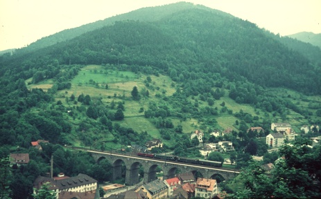 | Viadukt der Schwarzwaldbahn in Hornberg, vom Hornberger Schloss, 29.6.1975, Familienurlaub mit Quartier direkt an der Bahn, aber Autoanreise; Foto: Horst Jacobs |
