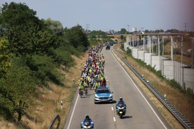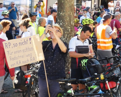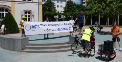Der ADFC engagierte sich bzgl. RS 13 beim Regierungspräsidium und beim Landesverkehrsministerium, bei dem das Verfahrensergebnis mit der Vorzugstrasse gerade liegt, in Richtung Neubewertung der Varianten. Unterstützend hatte er zu einer Fahrraddemonstration aufgerufen, die vom Fliederplatz in Mühlburg über die B 36 zum Rathaus in Rastatt führte mit einem Zwischenstopp in Durmersheim. An allen drei Versammlungspunkten wurde in Reden betont, wie widersinnig es wäre, den vorhandenen Begleitweg nicht zu nutzen und stattdessen größtenteils nur 200—300 m weiter westlich durch einige Gewerbegebiete zu fahren und teils sogar mit Verschlechterungen zum aktuellen Bestand. Deutlich über 200 Radfahrer folgten dem Aufruf, rechnet man die hinzu, die nur Etappen fuhren, könnten es auch 300 Unterstützer gewesen sein. Gefahren wurde mit Polizeibegleitung auf der Fahrbahn, egal ob Radwege vorhanden waren oder nicht (legal bei Verbandsfahrt). Die Ortsumgehung per neuer B 36 ist übrigens offen für alle, auch Radfahrer. Wer sich traut, kann dort auch alleine für eine schnelle Verbindung „demonstrieren“.