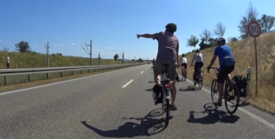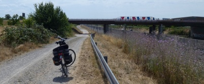 | Da drüben, links oberhalb von Neubaustrecke und Ortsumgehung der B 36 liegt der bahnbegleitende Weg, der Wunschtrasse von ADFC, vielen anderen Radfahrern und div. Kommunen ist; Demo-Foto: Actioncam, Heiko Jacobs |