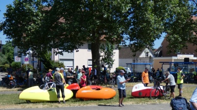 | Zwischenstopp der Demo in Durmersheim, an der auch Velomobile als besonders schnelle Räder teilnahmen. |