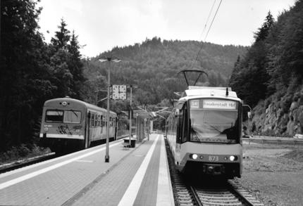 Im Süden von Karlsruhe macht der Ausbau der Murgtalbahn Fortschritte. Bis zum Freudenstadter Stadtbahnhof ist dann die Strecke elektrisch befahrbar. Das bedeutet, dass in Raumünzach nicht mehr umgestiegen werden muss; die Stadtbahnen also bis Freudenstadt-Stadt fahren können. Für die Anschlüsse in Freudenstadt-Hbf. nach Hausach und Eutingen/Horb verkehren Triebwagen der Baureihe 627.