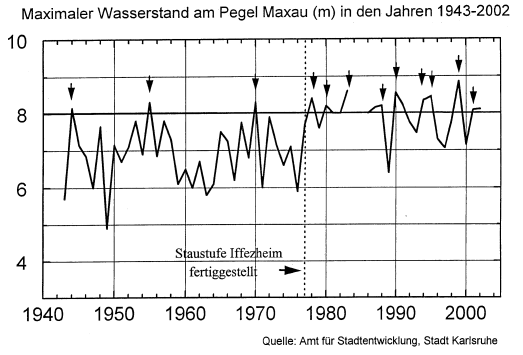 Durch den Ausbau des Oberrheins hat sich der Hochwasserschutz für die Rheinanlieger unterhalb der Staustufe Iffezheim deutlich verschlechtert. Lag vor 1955 der Abfluss des Rheinwassers am Pegel Maxau im Fall des statistisch alle 200 Jahre einmal auftretenden Hochwasserereignisses bei ca. 5000 m³/s (Pegelstand ca. 9,20 m), so ist dieser Wert nach Fertigstellung der Staustufen im Jahr 1977 auf ca. 5700 m³ (Pegelstand ca. 9,80 m) angestiegen. Auch wenn in den letzten 60 Jahren kein “200-jährliches Hochwasserereignis” aufgetreten ist, zeigt die Graphik, dass am Pegel Maxau seit 1977 die 8 m-Marke weit häufiger überschritten wurde als zwischen 1943 und 1977. Gründe für die Verschlechterung des Hochwasserschutzes unterhalb von Iffezheim sind der Verlust an Überflutungsflächen (Rückgang der Überflutungsfläche zwischen Basel und Maxau von 260 km² im Jahr 1920 auf 130 km² im Jahr 1980), die dadurch bedingte stark erhöhte Fließgeschwindigkeit des Rheins und die Überlagerung der Hochwasserscheitel von Schwarzwald- und Vogesenzuflüssen mit dem Hochwasserscheitel des Rheins.