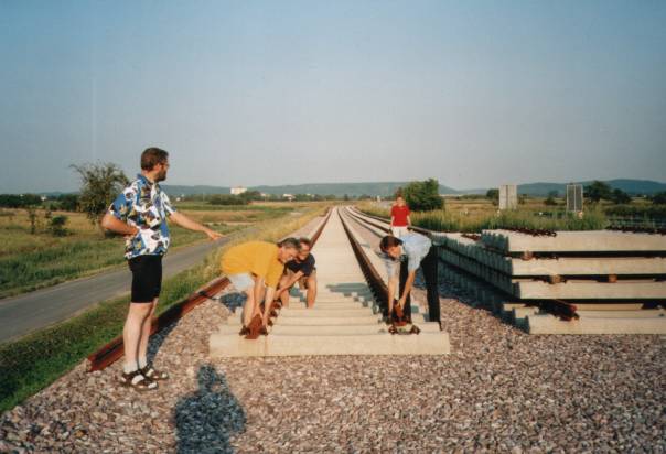 Sogleich hat unser Chefplaner einen Fehler im Gleisverlauf entdeckt: Drei mal Hauruck und die Schienen liegen richtig. So viele körperliche Aktivitäten machen hungrig. Auf geht's nach Spöck — immer der neuen Trasse nach. Ein Geröllfeld aus Buntsandstein kreuzt unseren Weg. Es wird als Wendeschleife erkannt und nach einigem Zögern mit Prädikaten “originell”, “nicht schlecht” und “das ist mal was anderes” bedacht.