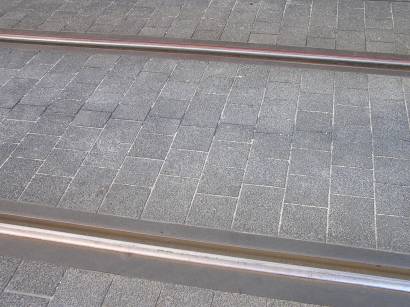 Nach Entfernen der alten Schienen wurde der Untergrund ausgebaggert und dann eine 30 cm dicke Tragschicht eingebracht. Darauf kam dann der eigentliche Clou, nämlich der Einbau von 40 cm dicken, 4 m langen und 2,90 m breiten Betonfertigteilen, die mit Hilfe von Kranwagen eingesetzt wurden. Das war dann auch das Schauspiel, das so viele Bewunderer anzog. Jedes dieser Teile wog 11 Tonnen und wurde von den Arbeitern passgenau an seinen zukünftigen Platz gesetzt, was zum Teil die Zuschauer sogar zu spontanem Applaus hinriss. Danach wurden die vorher verschweißten neuen Schienen in die dafür vorgesehenen Spurkanäle eingelassen und in ein Kunststoffbett verklebt. Für die gesamte Umbaumaßnahme waren zwei Wochen angesetzt worden, letztendlich war man dann sogar einen Tag früher fertig als geplant.