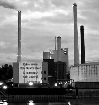 | Neben dem “Aktionsbündnis Saubere Luft Region Karlsruhe” protestiert auch Greenpeace mit Aktionen gegen das geplante Kohlekraftwerk, hier mit der Projektion eines Textes an die Wand des bestehenden Kraftwerkes. Foto: Dr. Morlock-Fien |
