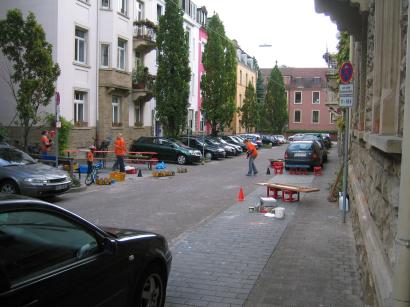 Ausgangspunkt war vor mehr als einem Jahr eine Umfrage der Grünen in den verkehrsberuhigten Bereichen Bürklin- und Lenzstraße. Zu viert haben wir in allen Haushalten gefragt, ob ein Spielbereich für Kinder gewünscht wird. In beiden Straßen gab es eine Mehrheit dafür. Da in der Bürklinstraße die Zustimmung besonders deutlich war, hatte unsere Gemeinderats-Fraktion dort eine exemplarische Sperrung von mehreren Parkplätzen für eine Spielzone beantragt. Die Stadtverwaltung hatte daraufhin als Kompromiss die Sperrung von 5 Parkplätzen von 11 bis 18 Uhr verfügt (siehe Titelbild). Wichtig war auch, dass das Gartenbauamt eine Bank aufgestellt hat, auf der Eltern und Kinder sich ausruhen können.