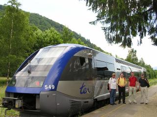Im Eventverkehr Müllheim — Mulhouse sah es etwas traurig aus: außer unserer Kleingruppe (5 Personen) saßen da noch ganze 3 Fahrgäste zusätzlich in dem französischen Triebwagen. In Mulhouse angekommen — es war schönes Wetter, sonnig und warm — haben wir einen kleinen Rundgang durch die Altstadt gemacht, haben uns den Place de la Réunion mit dem Renaissance Rathaus aus dem Jahre 1552, in dem heute das historische Museum untergebracht ist und die evangelische Stadtkirche St. Etienne mit ihren Glasfenstern aus dem 12. Jahrhundert angesehen. Viel Zeit hatten wir nicht, sie reichte noch nicht einmal zu einem französischen Mittagessen. Jetzt war die Straßenbahn dran: als erstes sind wir die Linie 1 vom Gare Centrale nach Rattachement abgefahren und dann den Zweig der Linie 2, der nach Coteaux führt. Dabei kamen wir an der Haltestelle Daguerre vorbei, von wo später einmal die Tram-train, eine Stadtbahn, die sowohl auf Straßenbahn- wie auch auf SNCF-Gleisen fahren kann, nach Lutterbach und Kruth abzweigen soll. Die Weichen und Anschlussgleise liegen bereits. Den kurzen Zweig der Linie 2 nach Nouveau Bassin konnten wir uns aus zeitlichen Gründen nicht mehr ansehen und auch das spektakuläre Eisenbahnmuseum, eines der größten Eisenbahnmuseen Europas mit 20.000 m² Ausstellungsfläche, musste ausgelassen werden, da die sonntäglichen Busverbindungen dorthin so spärlich sind, dass wir nicht rechtzeitig wieder zurückgekommen wären. Aber Wolfgang Melchert hatte den „ter-Fahrplan“ von Mulhouse dabei und schlug vor, eine Fahrt mit der Regionalbahn nach Kruth zu machen, eben der Bahnstrecke, die später mit der Stadtbahn befahren werden soll. Gesagt, getan. Und tatsächlich, wir konnten sehen, wie mindestens im Bereich von Mulhouse und näherer Umgebung an den Bahnhöfen schon Vorbeitungsarbeiten im Gange waren, Bahnsteige erhöhen u.ä. So hatte sich diese Fahrt — abgesehen, von der schönen Landschaft, durch die wir fuhren — auch bahntechnisch gelohnt.