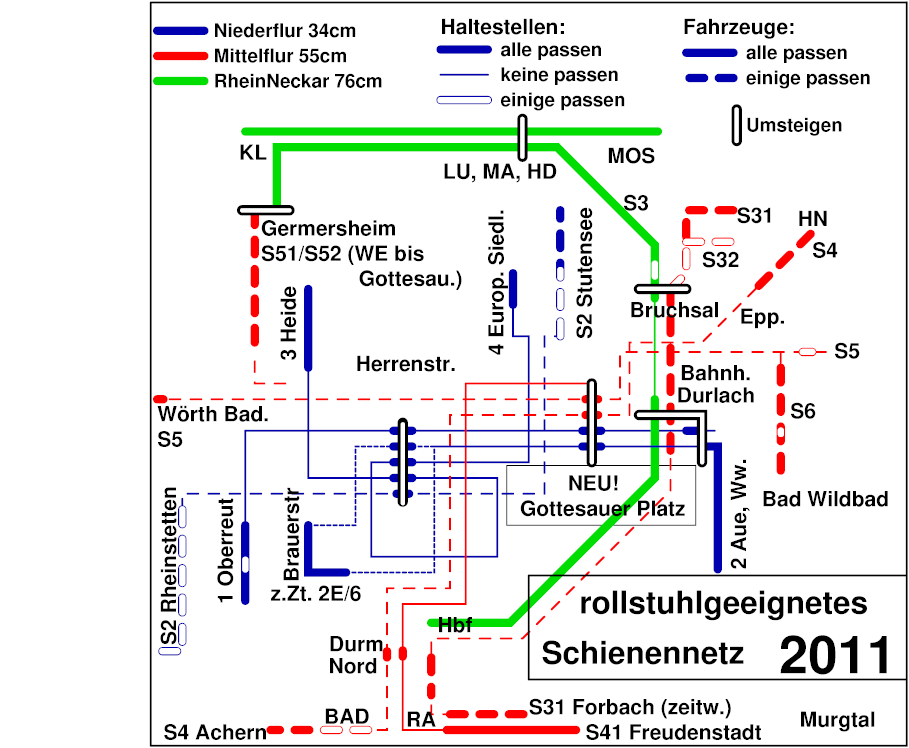 Nach der Inbetriebnahme der Haltestelle Gottesauer Platz ist ein weiterer sehr wichtiger Schritt zur barrierefreien Ausgestaltung des Stadtbahnnetzes gemacht, denn mit dieser Haltestelle entstand die erste Umsteigehaltestelle zwischen den niederflurigen Straßenbahnen und den ersten beiden Türen (!) mittelfluriger Stadtbahnen der Linien S4 und S5. Damit sind nun neu folgende Fahrziele aus Karlsruhe barrierefrei erreichbar, sofern passendes Wagenmaterial eingesetzt wird: