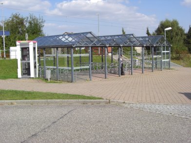 Fahrradparker an der Haltestelle Oberderdingen-Flehingen an der S4 mit einem Einzugsgebiet von ca. 10.000 Einwohnern mit teils luxuriöser Anbindung an die Nachbarorte (nach Oberderdingen ist der Radweg z. B. beleuchtet, hat selbstverständlich Winterdienst und ist abschnittsweise mit Blendschutz gegen die nahe Landstraße abgeschirmt.