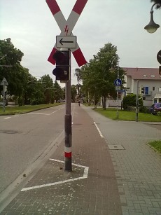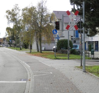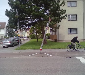 Die Stadtbahnlinie S2 fährt durch Rheinstetten auf einer eigenen Bahntrasse durch die Stadtteile Forchheim und Mörsch. Bei Übergängen im Gleisbereich wird an Querstraßen zur Stadtbahnlinie der Straßenverkehr mit Ampelanlage und Andreaskreuz geregelt. Wenn eine Bahn heranfährt, muss der parallel zur S2 fahrende Verkehr an der dann roten Ampel anhalten, bis die Bahn die Querstraße passiert hat. Parallel zu Schiene und Straße verlaufen auch Rad- und Fußwege. Die Ampelanlagen wurden unsinnigerweise auf der Mitte des Radweges platziert. Eine ständige Gefahr für die Radfahrer (s. Bild 1 u. 2). Dieser Tage wurde so ein Metallmast in Forchheim Hardtstraße / Karlsruher Straße in Schräglage versetzt (s. Bild 2), vermutlich unabsichtlich durch ein Kraftfahrzeug angefahren. Der Arbeitskreis Verkehr meldete den Schaden der AVG, die zuständigkeitshalber die VBK um Bearbeitung des Vorgangs bat. Die Verkehrsbetriebe Karlsruhe teilten daraufhin mit, dass der Mast in die Mitte zwischen Fuß- und Radweg gestellt wird. Dieser neue Standort zwischen Fuß- und Radweg hätte die gleiche Gefahr für Radfahrer und eine noch größere Gefahr für Räder mit Anhänger, Dreiräder, Lastenräder, Rikschas etc. bedeutet.