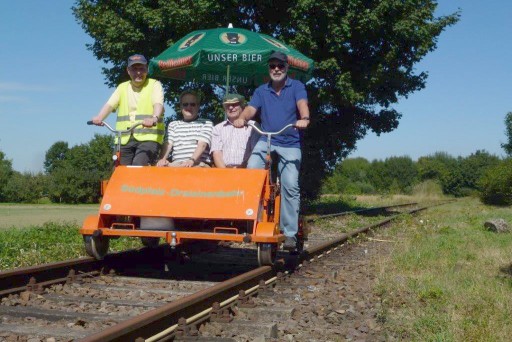 Am Freitag, dem 16.8.2013 haben einige Mitglieder von Pro Bahn die Südpfälzer Draisinenbahn erkundet. Um 9.24 h fuhren wir mit der RB vom Karlsruher Hbf nach Landau und mit dem Bus weiter zum Startpunkt der Draisinenbahn beim Gewerbegebiet und Einkaufszentrum Bornheim, wo wir pünktlich 10.50 h angekommen sind. Viele Menschen wollten bei schönstem Wetter mit Muskelkraft auf der stillgelegten Bahn fahren. Anreise in der Regel mit dem Pkw. Etwa 11.40 h übernahmen wir unsere Draisine und los ging es auf der 13 km langen Strecke bis zur Endstation im Westen von Lingenfeld. Wir mussten 11 Übergänge passieren. An den Straßenübergängen hatten wir Schranken und mussten mit Ampeln den Weg freimachen. Wir fuhren auf einer weitgehend geraden Bahn mit sehr geringem Gefälle. Nur an Haltestellen machte die Bahn mehrmals für uns unverständliche „Schlenker“. Zunächst ging es durch Wald weit ab von größeren Siedlungen auf großenteils verfaulten Holzschwellen. Erst bei Zeiskam fuhren wir auf stabilen Betonschwellen an bewohnten Gebieten vorbei. Auf einer Strecke von rund 2 km führte die Bahn dicht an Lustadt vorbei und schließlich durch Westheim. Statt Wald waren beiderseits der Bahn Felder. In den westlichen Wohngebieten von Lingenfeld endete unsere Fahrt und wir machten Mittagsrast. Lingenfeld muss bis spätestens 14 h erreicht sein. Danach geht es zurück nach Bornheim. Wir machten neben dem ehemaligen Bf. Hochstadt eine Kaffeepause.