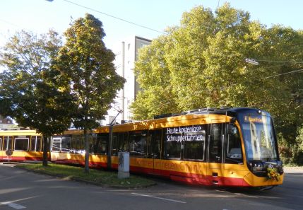 | Die Zukunft: Die neue Niederflur-Straßenbahngeneration für den innerstädtischen Verkehr und erstmals für den Verkehr auf der S1/S11: Somit werden auch Bad Herrenalb und Ittersbach barrierefrei erreichbar! Sie ersetzen peu a peu die Hochflur-Stadtbahnen, bei denen sich die Umrüstung auf Tunnelbetrieb nicht mehr lohnt, weil sie dann ca. 30-35 Jahre alt sein werden. |