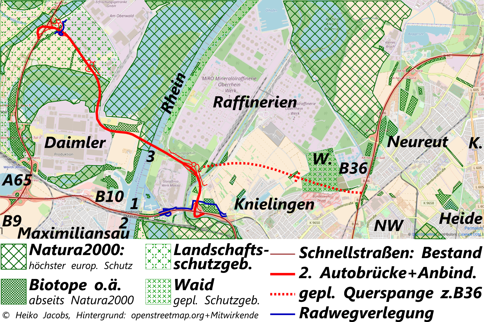 Dabei waren es vor allem die großen naturschutzrechtlichen Bedenken auf Pfälzer Seite, die die Planer bis heute nicht in den Griff bekommen haben, die den Erlass der Planfeststellungsbeschlüsse verzögern. Es ist schon viel über die Unsinnigkeit dieses Projektes vor allem aus verkehrlicher Sicht gesagt und geschrieben worden, daher sollen an dieser Stelle auch einmal mehr Aspekte jenseits des Themas Verkehr betrachtet werden. Die auf badischer Seite geplante Trasse der neuen Brücke und ihrer Zufahrten durchschneidet oder berührt zahlreiche Biotope in der Rheinniederung, die bereits heute durch Straßen und Gewerbeflächen zerteilt sind. Umso wichtiger ist also, diese verbliebenen Lebensrauminseln vor einer weiteren Beeinträchtigung zu schützen. Einige der hier vorkommenden Tierarten sind selten und streng geschützt wie beispielsweise alle Fledermausarten, mehrere Amphibienarten oder die Zauneidechse. Abgesehen von der fortschreitenden Zerschneidung der Lebensräume, die je nach Art früher oder später zum Erlöschen von Populationen führt, kommt es durch die Baumaßnahmen jedoch auch zur direkten Vernichtung von Biotopen, etwa von Gewässern, die als Laichplätze für Amphibien von Bedeutung sind. Auch zahlreiche (Auen-)Waldlebensräume und Wiesenflächen sind davon betroffen. Der hohe Versiegelungsgrad und die baustellenbedingten Störungen durch Lärm und Staub sind weitere negative Auswirkungen. Für den Menschen direkt wahrnehmbar wird es zu einer Beeinträchtigung des Landschaftsbildes und der Erholungsfunktion in dem Gebiet kommen.