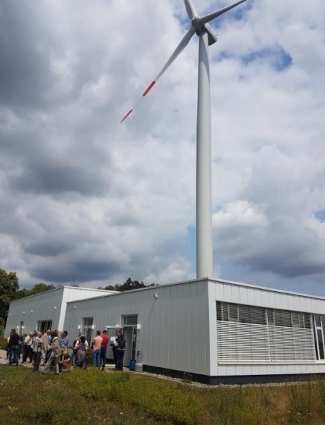 Die 140 m hohe WEA mit 2 MW Nennleistung bildet mit der daneben aufgebauten Batteriehalle eine Einheit zur Versorgung mit stabiler erneuerbarer Energie.