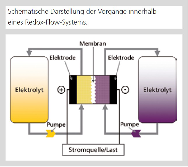 | Schematische Darstellung der Vorgänge innerhalb eines Redox-Flow-Systems. Mit freundl. Genehmigung Dr. Peter Fischer, Fraunhofer-Gesellschaft ICT | |