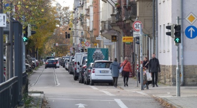 Für den Radverkehr gibt es dort bisher ... ... nichts! Man hat als Radfahrer derzeit die Wahl, entweder zwischen rechter Schiene und Parkierung zu fahren, mit Gefahren durch unvorsichtig geöffnete Türen oder zu enges Überholen, oder zwischen den Schienen, mit Gefahren durch ebendiese oder Schrägausparker, oder Umwege über Yorck- oder Gustav-Heller-Platz zu fahren mit teils anderen Gefahrenstellen — Alle Auswahlmöglichkeiten sind suboptimal.